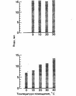 Рис.11. Действие температуры в помещении на питье у горлиц. Вверху: влияние температуры во время лишения воды на последующее питье. Внизу: влияние температуры во время питья. |