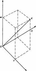 Рис.13. Голод, изображенный в виде многомерной векторной величины; ж - жир; б - белок; у - углевод; о - исходная точка; х - состояние голода. |