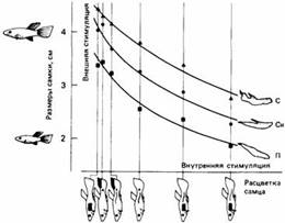 Рис. Влияние силы внешней стимуляции и внутреннего состояния на ухаживание самцов гуппи. Кривые изображают сочетания внешнего стимула и внутреннего состояния, вызывающие сигмовидные позы ухаживания возрастающей интенс ивности,. |