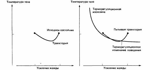 Последствия поведения можно представить в мотивационном пространстве состояний. Исходное состояние изображается в виде точки в этом пространстве. Поведение животного изменяет его состояние, и точка описывает некоторую траекторию. На странице, имеющей два измерения, эта траектория изображается только в одной плоскости, но можно представить себе, что меняющееся состояние описывает соответствующую траекторию в многомерном пространстве. Достоинство такого типа изображения состоит в том, что можно относительно просто показать очень сложные изменения состояния. Например, когда животное пьет холодную воду, мы можем видеть, что решения изменить поведение зависят отчасти от этой траектории и отчасти от положения соответствующих мотивационных изоклин.