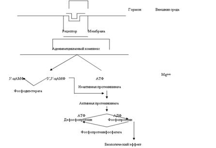 Под влиянием аденилатциклазы из АТФ синтезируется цАМФ, вызывающий активацию протеинкиназ в цитоплазме клетки, обеспечивающих фосфорилирование многочисленных внутриклеточных белков. Это изменяет проницаемость мембран, т.е. вызывает типичные для гормона метаболические и, соответственно, функциональные сдвиги. Внутриклеточные эффекты цАМФ проявляются также во влиянии на процессы пролиферации, дифференцировки, на доступность мембранных рецепторных белков молекулам гормонов.