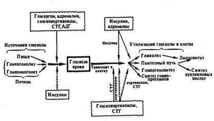 Приток глюкозы из печени и почек определяется соотношением активностей гликогенфосфорилазной и гликогенсинтетазной реакции в печени, соотношением интенсивности распада глюкозы и интенсивности глюконеогенеза в печени и отчасти в почке. Поступление глюкозы в кровь прямо коррелирует с уровнями фосфорилазной реакции и процессов глюконеогенеза. Отток глюкозы из крови в ткани находится в прямой зависимости от скорости ее транспорта в мышечные, адипозные и лимфоидные клетки, мембраны которых создают барьер для проникновения в них глюкозы (напомним, что мембраны клеток печени, мозга и почек легко проницаемы для моносахарида); метаболической утилизации глюкозы, в свою очередь зависимой от проницаемости к ней мембран и от активности ключевых ферментов ее распада; превращения глюкозы в гликоген в печеночных клетках (Левин и др., 1955; Ньюсхолм, Рэндл, 1964; Фоа, 1972). Все эти процессы, сопряженные с транспортом и метаболизмом глюкозы, непосредственно контролируются комплексом гормональных факторов.