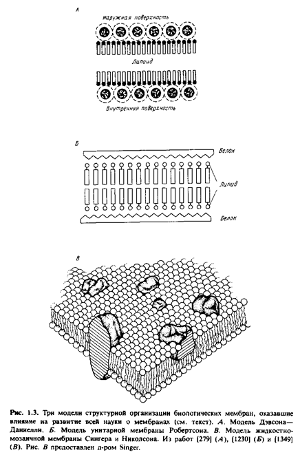 Концепция бимолекулярной липидной мембраны получила дальнейшее развитие в предложенной в 1935 г. модели Дэвсона-Даниелли, или модели "сэндвича", в которой предполагалось, что белки покрывают поверхность липидного бислоя. Это была необыкновенно удачная модель, и в течение последующих 30 лет многочисленные экспериментальные данные, особенно полученные с помощью дифракции рентгеновских лучей и электронной микроскопии, полностью подтвердили ее адекватность. Однако тогда же обнаружилось, что мембраны выполняют огромное множество функций, и чтобы объяснить этот феномен, исходная модель Дэвсона-Даниелли неоднократно подвергалась модификациям.