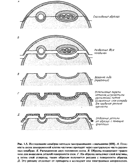 Некоторую информацию о расположении мембранных белков дали новые методы, ставшие теперь уже "классическими", - методы замораживания-скалывания и замораживания-травления. В этих случаях препараты быстро замораживают, не подвергая их при этом каким-либо повреждающим воздействиям, как при получении тонких срезов. Процесс подготовки препарата включает следующие операции.