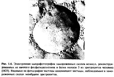 На рис.1.6 приведена электронная микрофотография препарата протеолипосом, реконструированных из яичного фосфатидилхолина и нефракционированного препарата белка полосы 3 из мембраны эритроцитов человека; препарат получен методом замораживания - скалывания.