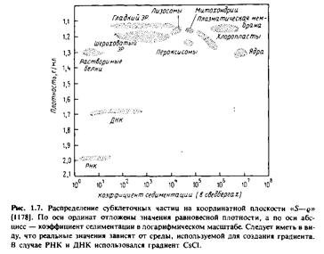 В настоящее время для разделения мембран чаще всего применяют центрифугирование. Мембранные частицы можно разделить по скорости их седиментации или по плавучей плотности. Первый метод называется зональным центрифугированием, и разделение происходит в соответствии со значениями S, а второй - изопикническим центрифугированием, и разделение происходит в условиях равновесной плотности. На практике обычно применяют некий гибрид этих двух методов. На рис.1.7 показано положение некоторых субклеточных единиц на координантной плоскости "S-g".