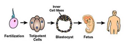 Стволовые клетки клетки делят на три основных типа. Первый тип, "тотипотентные" стволовые клетки образуются при первых делениях оплодотворенной яйцеклетки. Они могут превращаться в любой тип ткани и формируют весь организм в целом. Примерно через пять дней после оплодотворения формируется бластоциста - полый пузырек, который образуют около 100 клеток. Те клетки, что находятся снаружи, развиваются в плаценту, а те, что внутри, превращаются собственно в эмбрион. Эти 50 или около того клеток являются "плюрипотентными", они могут превратиться почти во все виды ткани, но не в целый организм. По мере того как эмбрион развивается дальше, стволовые клетки становятся "мультипотентными". Теперь они могут порождать лишь специфические типы клеток. Тотипотентные и плюрипотентные клетки именуют также зародышевыми стволовыми клетками, а мультипотентные часто называют взрослыми стволовыми клетками.
