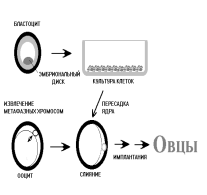 | ооцитов с клеткой из тотипотентной клеточной линии. Полученные таким образом эмбрионы временно помещались в овцу-реципиента. через неделю проверяли уровень их развития. Наконец, морулы и бластоцисты имплантировались другим овцам, где и проходил весь онтогенез. | |