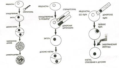 Репродуктивное клонирование. Если полученный «в пробирке» зародыш с генетическим материалом соматической клетки возвращается в матку, создается возможность действительно получить клон, то есть существо, копирующее физические и врожденные психические свойства донора генетического материала. Вероятно, такие дети появятся в ближайшие годы — слишком уж много говорится об этой возможности. Опасности для генетического благополучия человечества (для человеческого генофонда) клонирование представлять не может — эта процедура никогда не заменит естественное воспроизводство и не сможет заметным образом сократить разнообразие генотипов в человеческих популяциях. Естественно, научные возражения против клонирования заключаются в том, что технически процедура недостаточно отработана и может привести к появлению физически дефектных детей. Кто в таком случае несет за это ответственность? Кто будет содержать и воспитывать неполноценного ребенка? Сомнительность с этической точки зрения процедуры клонирования состоит в том, что нарушаются естественные принципы уникальности личности и происхождения каждого человека от двух родителей. Можно опасаться, что в семье и обществе «клонированный» ребенок не будет чувствовать себя комфортно, а его психическое развитие заведомо будет проходить с искажениями. С религиозной точки зрения рождение каждого человека выражает промысел Бога (при этом предполагается, что Бог управляет случайностью, или, иначе говоря, «играет в кости»). В таком случае смерть человека есть тоже Божий промысел, следовательно, надо осуждать и реанимацию, особенно выведение человека из состояния клинической смерти. Последнее, однако, делается с благой целью — помочь человеку. Тогда надо рассматривать и оценивать и мотивы для клонирования: есть ли это тщеславие, эгоизм, стремление к материальной выгоде или желание бесплодных родителей иметь детей, воспроизводящих их генотип. Можно представить и такую ситуацию, когда 50летние родители, потерявшие сына или дочь, хотят воспроизвести своего ребенка. Если соматические клетки были соответствующим образом законсервированы при жизни человека, они могут быть использованы для клонирования.