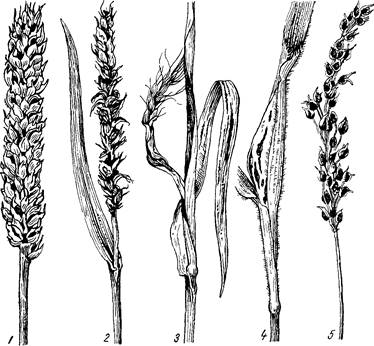 Диагностика. Возбудители головни поражают все хлебные злаки. Заражение растений происходит в молодом возрасте, чаще в эмбриональный период. Разрушению подвергаются отдельные завязи или целые соцветия, стебли, листья. На пораженных органах образуется черная пылящая масса. В зависимости от разрушения тех или иных органов, а также от признаков проявления заболевания различают на хлебных злаках несколько типов головни: пыльную, твердую, пузырчатую, стеблевую, карликовую (рис. 1).
