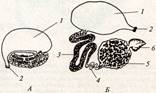 1 –урночка, 2 – мезентерий кишечника, 3 – стенка тела, 4 – фагоциты, наполненные тушью;Б – прикреплённая и плавающая урночки сипункулид.