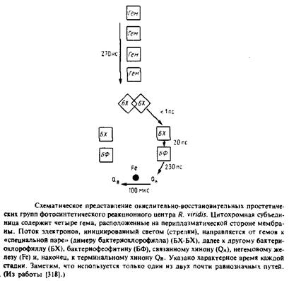 Фотосинтетические реакционные центры представляют собой комплексы белков с пигментами; в них происходит первичное разделение зарядов в фотосинтетических мембранах. Лучше всего охарактеризованы комплексы из пурпурных несерных бактерий; они обычно состоят из трех белковых субъединиц - Н, М и L. Реакционный центр Rhodopseudomonasviridis имеет также четвертую субъединицу - цитохром с-типа. Простетическими группами этого комплекса являются четыре гемогруппы, четыре бактериохлорофилла Ь, два бактериофеофитина, одно негемовое железо, один менахинон и одинубихинон. Под действием света электрон переходит от первичного донора электронов, так называемой "специальной пары" - молекул бактериохлорофилла, образующих димер, к бактериофеофитину, а затем к первичному хиноновому акцептору QA . В конце концов электрон восстанавливает вторичный акцептор Qb в ходе реакции, при которой протоны поступают из раствора на восстановленный хинон. Qbнаходится в равновесии с хинонным пулом в би-слое. Окисленный первичный донор электронов, "специальная пара", восстанавливается цитохромом с-типа. Поскольку цитохром и хинон расположены на противоположных сторонах фотосинтетической мембраны, светозависимый электронный транспорт электроге-нен и генерирует трансмембранную разность потенциалов.