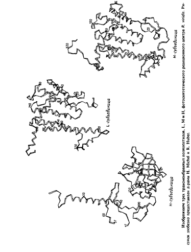 Суммарная мол. масса реакционного центра из R. viridisсоставляет примерно 150 ООО, а кажущаяся мол. масса субъединиц - 38 ООО, 35 ООО, 28 ООО и 24 ООО. Заметим, что электрофорез в ПААГ-ДСН дает неправильные молекулярные массы для Н, М и Lсубъединиц; об этом свидетельствуют данные о числе аминокислотных остатков в каждом полипептиде, полученные при секвенировании ДНК. Очищенный комплекс был закристаллизован с использованием сульфата аммония как осаждающего агента в присутствии детергента N. N-диме-тилдодециламин-М-оксида и органического амфифильного соединения гептан-1,2,3-триола. Кристаллы были в достаточной степени упорядочены и фотохимически активны. Структура этого четырехсубъединичного белка была установлена с разрешением около 3 А. Детергент в кристаллах не упорядочен, поэтому невозможно точно определить положения границ погруженных в мембрану участков. Размеры комплекса - 30 х 70 х 130 A. L - и М-субъединицы содержат по пять трансмембранных а-спиральных участков, а у Н-субъединицы такой участок только один.