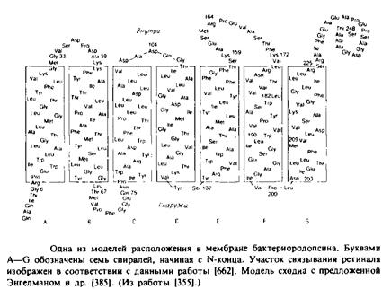 Все построенные модели сходны в интерпретации общей укладки и топологии молекулы. На рис.3.8 представлена модель, аналогичная предложенной Энгелманом и др. Установлено, что для пересечения неполярной части бислоя спираль должна содержать 21 аминокислотный остаток, и в белковой молекуле действительно имеется семь участков примерно такой длины с преобладающим содержанием неполярных аминокислот. Полагают, что они и образуют семь а-спиралей, наблюдаемых на карте электронной плотности.