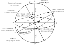 Рисунок 1 – Основные точки и линии небесной сферы; стрелкой указано направление ее вращения