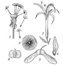 Примеры плодов бобовых (рисунок 8): 1 – типичный плод вики, 2 – разламывающийся боб копеечника, 3 – спирально закрученный боб люцерны, 4 – односемянной боб эспарцета, 5 – крылатый одно–двусемянной боб красного сандалового дерева.
