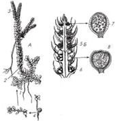 Рисунок 5. Селагинелла обыкновенная: А – спорофит: 1 – придаточный корень, 2 – стебель с листьями, 3 – стробил, 4 – молодой спорофит; Б – стробил со спорангиями: 5 – микроспорангий, 6 – мегаспорангий, 7– микроспора, 8 – мегаспора