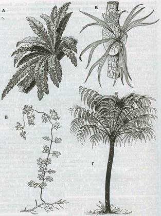 Рис. 1 - Жизненные формы папоротников: А, Б - эпифитные папоротники - асплениум гнездовый (Aspleniumnidus); платацериум (Р1аcerium); В - листовая лиана лигодиум (Lygodium); Г - древовидная форма
