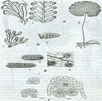 Рис. 3 - Типы размещения спорангиев и сорусов: А - расположение одиночных спорангиев: 1 - верхушечное по отношению к долям листа у даваллиевых (Davalliacеае); 2 - краевое у трихоманеса (Тrichomanes); Б - расположение сорусов: 1 - краевое у гименофилла (Нуmophillum); 2 - на нижней стороне листа у кочедыжника ломкого (Суstopterisfragilis); В - синангии у мараттиевых (Магаttiacеае): 1 - Аngiopteris; 2 - Магattiа; 3 - Сhristensiа; Г -перемещение спорангиев на нижнюю поверхность листа в ходе морфогенеза у схизеи (Schizaea); сп -спорангий