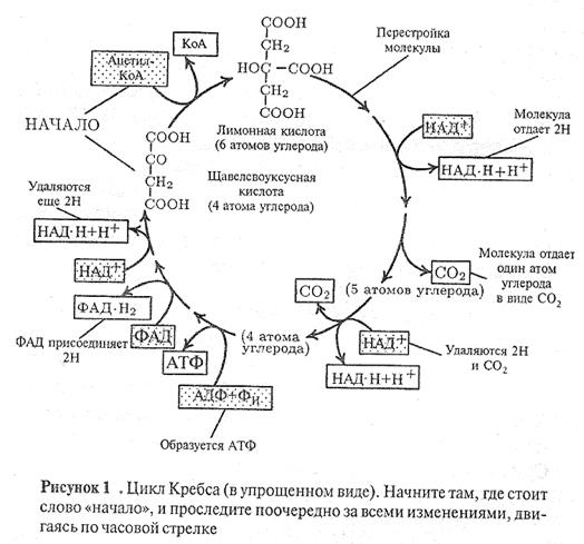 В цикл Кребса вступает ацетил–КоА, образованный на предыдущей стадии. Ацетил–КоА взаимодействует со щавелево-уксусной кислотой, в результате образуется шестиуглеродная лимонная кислота. Для этой реакции требуется энергия; ее поставляет высокоэнергетическая связь ацетил–КоА. В конце цикла щавелево-лимонная кислота регенерируется в прежнем виде. Теперь она способна вступить в реакцию с новой молекулой ацетил–КоА, и цикл повторяется. Суммарно реакция цикла может быть выражена следующим уравнением: