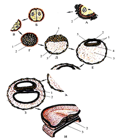 Рис.1. Дробление зиготы и образование зародышевых листков А - оплодотворение: 1 - сперматозоид; 2 - яйцеклетка; Б; В - дробление зиготы, Г - морубластула: 1 - эмбриобласт; 2 - трофобласт; Д – бластоциста: 1-эмбриобласт; 2 - трофобласт; 3 - полость амниона; Е - бластоциста: 1-эмбриобласт; 2-полость амниона; 3 - бластоцель; 4 - эмбриональная энтодерма; 5-амнионитический эпителий - Ж - И: 1 - эктодерма; 2 - энтодерма; 3 – мезодерма.