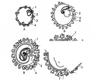 А - 2-3 нед; Б - 4 нед: 1 - полость амниона; 2 - тело эмбриона; 3 - желточный мешок; 4 - трофоласт; В - 6 нед; Г - плод 4-5 мес: 1 - тело эмбриона (плода); 2 - амнион; 3 - желточный мешок; 4 - хорион; 5 - пупочный канатик.