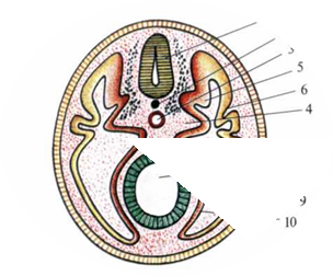 Рис.3. Поперечный разрез через тело зародыша (схема): 1 - нервная трубка; 2 - хорда; 3 - аорта; 4 - склеротом; 5 - миотом; 6 - дерматом; 7 - первичная кишка; 8 - полость тела (целом); 9 - соматоплевра; 10 – спланхноплевра.