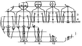 КМ - средняя линия. Цифры справа показывают соотношения частей тела у детей и взрослых, цифры внизу – возраст.