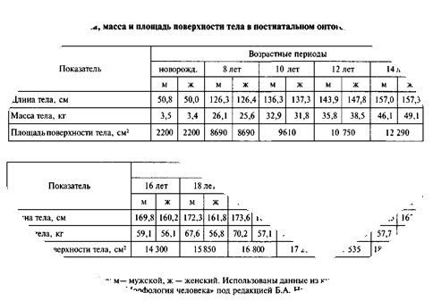 Большинство антропометрических показателей имеет значительные индивидуальные колебания. В табл.2 приведены некоторые Усредненные антропометрические показатели в постнатальном онтогенезе.