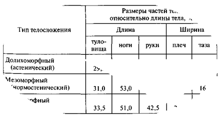 Гармоничность пропорций тела является одним из критериев при оценке состояния здоровья человека. При диспропорции в строении тела можно думать о нарушении ростовых процессов и обусловивших его причинах (эндокринных, хромосомных и др.). На основании вычисления пропорций тела в анатомии выделяют три основных типа телосложения человека: мезоморфный, брахиморфный, долихоморфный. К мезоморфному типу телосложения (нормостеники) отнесены люди, анатомические особенности которых приближаются к усредненным параметрам нормы (с учетом возраста, пола и т.д.). У людей брахиморфного типа телосложения (гиперстеники) преобладают поперечные размеры, хорошо развита мускулатура, они не очень высокого роста. Сердце расположено поперечно благодаря высоко стоящей диафрагме. У гиперстеников легкие более короткие и широкие, петли тонкой кишки расположены преимущественно горизонтально. Лица долихоморфного типа телосложения (астеники) отличаются преобладанием продольных размеров, имеют относительно более длинные конечности, слабо развитые мышцы и тонкую прослойку подкожного жира, узкие кости. Диафрагма у них расположена ниже, поэтому легкие длиннее, а сердце расположено почти вертикально. В табл.3 приведены относительные размеры частей тела у людей разных типов телосложения.