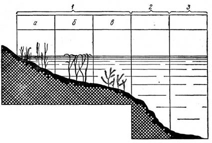 1 — літоральна зона (а — напівводяні рослини, б — плаваючі рослини, в — занурені рослини); 2 — субліторальна (перехідна зона); 3 — профундальна зона.