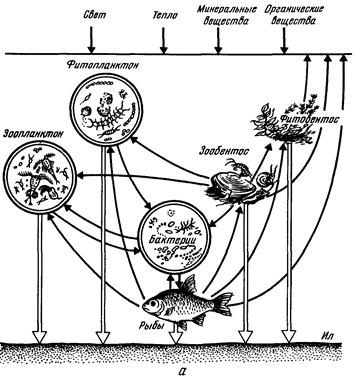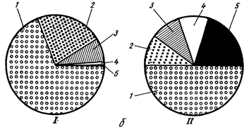 Рис 1. Процес круговороту речовин у водоймі (а) і частка риб у загальній біологічній продукції і біомасі природних водойм (б): І - співвідношення різних видів біологічної продукції, ІІ - співвідношення біомаси, 1 - фітопланктон, 2 - бактерії, 3 - зоопланктон, 4 - донні організми, 5 – риба.