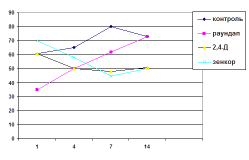 Вченими встановлено неоднозначність можливих шляхів формування відповідних реакцій організму протягом 14 доби на дію з гербіцидів, про що свідчить різна динаміка гематологічних показників двухлеток коропа (мал.1).