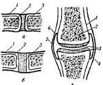 а - волокнисте: 1 - окістя; 2 - кістка; 3 - волокниста тканина; б - хрящове: 1 - окістя; 2 - кістка; 3 - хрящ; в - синовіальне (суглоб); 1 - окістя; 2 - кістка; З - суглобовий хрящ, 4 - порожнина суглоба; 5 - синовіальна перетинка капсули суглоба; 6 - волокниста перетинка капсули суглоба.