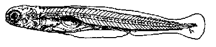 Этап шестой (Е) – личинки длиной 15,7-18,8 мм. Длительность 13 суток. Жаберные крышки полностью окостенели. Появились первые две петли кишечника. Во всех парных и непарных плавниках хорошо развиты костные лучи. Редуцированы остатки плавниковой складки позади спинного и анального плавников. Брюшные плавники выступают за края преанальной складки. Спектр питания тот же, что и на пятом этапе. (рис. 8).