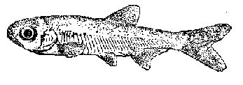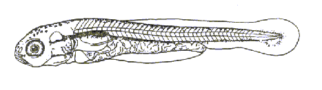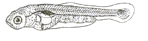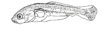 Этап F – личинка достигает длины 16,0-19,0 мм. Продолжительность этапа 6 суток. Рот перемещается в нижнее положение. Обонятельное отверстие полностью разделено перегородкой на два. Мягкие лучи в непарных плавниках становятся ветвистыми. Остатки плавниковой складки полностью редуцируются. Заканчивается формирование позвонков и рёбер. Вентральные концы миотома смыкаются по средней линии. Жаберные крышки и бока приобретают серебристую окраску. В конце этапа на теле появляется чешуя. Питаются зоопланктоном и зообентосом. (рис. 9).