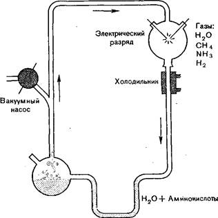 Природа всех конкретных процессов, приведших к возникновению жизни, неизвестна. Тем не менее, было высказано несколько правдоподобных предположений о возможных путях этого-процесса. Мы не располагаем методами, позволяющими точно выяснить, какими были условия на Земле в то время, поэтому в этих вопросах очень большое место занимают догадки. Кроме того, ввиду изменившихся условий, существующих на нашей планете в настоящее время, и медленности рассматриваемого процесса, экспериментальная проверка предположений о путях, приведших к возникновению живого вещества, невозможна. Но несмотря на все эти затруднения, в 1953 г. Стэнли Л. Миллер из Чикагского университета провел простой эксперимент, подтверждающий правильность основной идеи. В этом эксперименте в герметически закрытом приборе циркулировала смесь газов, которые, по общему мнению, наиболее вероятно содержались в ранней атмосфере Земли: метан, аммиак, водород и водяные пары. В определенном месте через эту смесь пропускали электрический разряд, имитирующий молнию. Миллер проводил этот эксперимент в течение недели, а затем подверг анализу образовавшиеся продукты и обнаружил среди них небольшие количества аминокислот — основных компонентов белков и одних из главных органических веществ, содержащихся в любом живом существе.