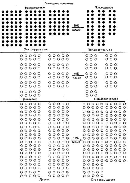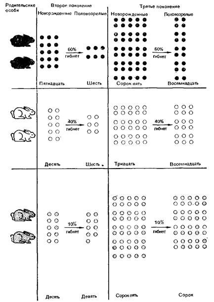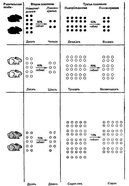 Три гипотетические пары кроликов различаются только по окраске. Каждая пара приносит по 10 крольчат. Черные и белые кролики более заметны, чем серые, а поэтому соответственно 60 и 40% их потомков гибиет до достижения половозрелости, тогда как у серых кроликов гибиет только 10% крольчат. По прошествии трех поколений черные кролики, составлявшие З3'/з% исходной популяции, составляют всего лишь 16/250=6,4%, несмотря иа увеличение их абсолютного-числа. Относительная численность белых кроликов также снизилась до 55/250= 21,6%. Численность же серых кроликов, напротив, возросла с 33 1/3 до 180/250=72%.