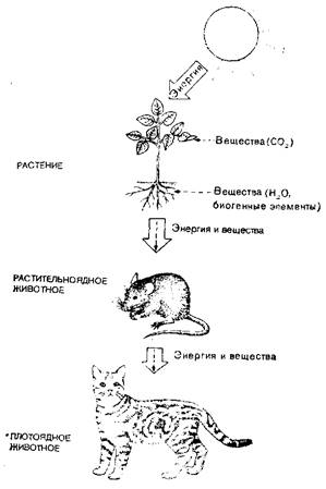 Организмы получают энергию из двух источников. Одним источником служит Солнце, излучающее доступную организмам энергию в форме света. Другой источник энергии — это определенные богатые химической энергией неорганические вещества, такие, как нитраты и сульфаты, но главным образом — богатые энергией органические соединения, содержащиеся в телах живых и мертвых организмов. Неорганические молекулы, необходимые организмам в качестве строительных блоков, также распределены неравномерно: они содержатся в низких концентрациях в виде ионов в водах морей и рек и в почвенных растворах, а в высоких концентрациях — в составе живых организмов.