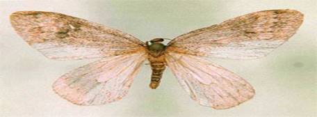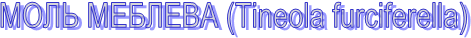 МОЛЬ МЕБЛЕВА (Tіneola furcіferella) Це невеликий метелик (розмах крил- 1 -1,5 див) з жовтуватими або темно-жовтими передніми крилами і жовтувато-сірі задніми; обидві пари крил блискучі, з помітним золотавим відтінком. Самка відкладає яйця протягом двох тижнів і за цей час може відкласти до 300 яєць. Розвиток проходить швидко: цикл одного покоління продовжується від 2 до 4 місяців. За рік змінюється до 4 поколінь, і тому літаючих метеликів можна бачити майже цілий рік. Гусениці линяють 6-8 разів. Вони плетуть шовкові трубчасті ходи, вплітаючи в них залишки їжі й екскременти. Окукливание відбувається наприкінці ходу в пухкому коконі. Лялечка розвивається від 7 до 18 днів.
