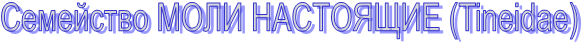 Семейство МОЛИ НАСТОЯЩИЕ (Tineidae) К семейству относятся мелкие, часто невзрачные бабочки, о внешности которых дают представление широко известные виды этого семейства, часто поселяющиеся в домах и причиняющие много неприятностей человеку. У настоящих молей обычно сильно развиты челюстные щупики, в то время как хоботок может быть недоразвит. Передние крылья длинные и узкие, на задних имеется широкая бахромка из волосков. Гусеницы живут в переносных чехликах. Семейство представлено огромным числом родов и видов, распространенных по всему земному шару. Многие виды настоящих молей связаны в своей жизни с лесом, где они обитают на стволах деревьев, пнях, трутовых грибах, в подстилке птичьих гнезд и т. д. Кроме растительноядных форм, среди настоящих молей есть большое количество видов, питающихся различными продуктами животного происхождения, такими как волос, мех, шерсть, перо, кожа, рог, кости, сухое мясо и др. Характерной особенностью их является способность переваривать кератин и другие труднорастворимые органические вещества. Среди таких молей - кератофагов выделяется группа видов космополитов, развезенных человеком по всему свету.