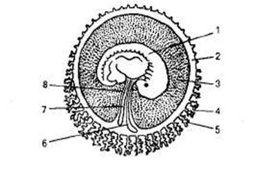 Рис. 2.5. Схема зародышевых оболочек: 1 – зародыш; 2 – амнион и его полость (3), заполненная амниотической жидкостью; 4 – хорион с ворсинками, образующими детское место (5); 6 – пупочный или желточный пузырь; 7 – аллантоис; 8 – пуповина