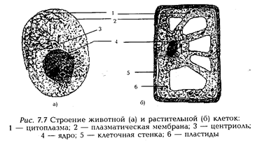Основные структурные различия между животными и растительными клетками немногочисленны. Во-первых, животные клетки, в отличие от растительных (исключая низшие растения), содержат небольшие тельца – центриоли , расположенные в цитоплазме. Во-вторых, как уже говорилось, клетки растений имеют в своей цитоплазме белковые образования – пластиды, которых нет у животных. И в-третьих, клетки растений обладают упомянутой ранее клеточной стенкой, благодаря которой они сохраняют свою форму. Животные клетки располагают лишь тонкой плазматической мембраной и поэтому способны двигаться и менять форму.