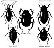 Серьезными сельскохозяйственными вредителями считаются также крошечные листоеды —- крестоцветные и свекловичные блошки. Среди 40 тыс. видов мелких жучков — долгоносиков, или слоников, с вытянутой в трубку головой также немало вредителей (клубеньковые,долгоносики, яблоневый цветоед, амбарные долгоносики и многие другие).