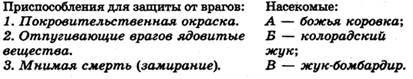 Соотнесите приведенные примеры приспособлений для защиты от врагов и насекомых, их использующих: