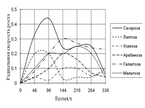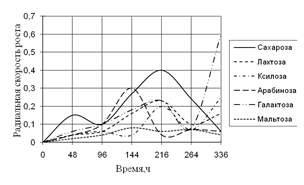 Рис. 1. Радиальная скорость роста A . niger на сахарах