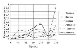 Из данных рисунка 4 видно, что A . flavus хорошо растет на среде с сахарозой. Но к концу культивирования наибольшая скорость роста наблюдается с галактозой. Максимальные биоритмы приходятся на начальный момент времени культивирования – 48–144 ч.