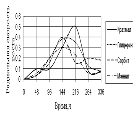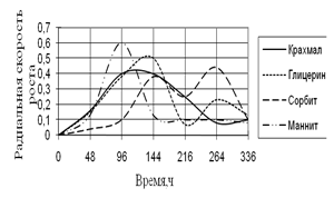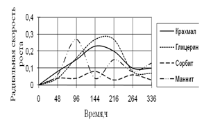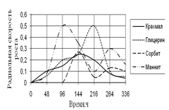 Рост A . terreus наблюдается на всех легкоусвояемых источниках углерода, кроме среды с сорбитом. Вначале и в конце культивирования радиальная скорость роста примерно одинаковая. В середине инкубации наблюдаются скачки роста, особенно на среде с глицерином. Наибольшие биологические ритмы приходятся на 144–264 ч. времени культивирования.
