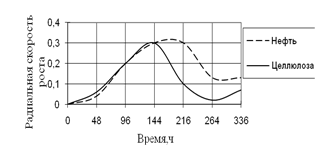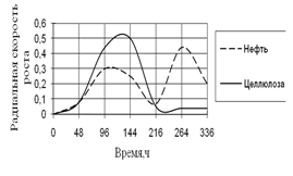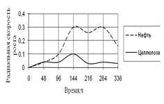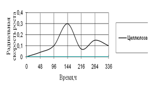 На трудноразлагаемых источниках углерода рост A . niger наблюдается на средах с целлюлозой и нефтью. В начале инкубации скорость роста на обеих средах одинакова, затем резко увеличивается на среде с целлюлозой, но к концу культивирования она становится минимальной, и происходит скачок роста на среде с нефтью. Максимальные биологические ритмы приходятся к середине времени культивирования – к 96–216 ч.