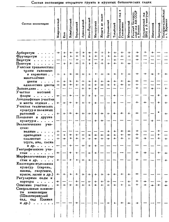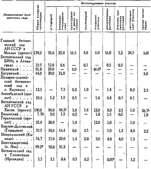 Ботанические сады, как уже отмечалось выше, различаются и содержанием своих экспозиций. В некоторых из них коллекции растений представлены очень широко, в других они имеют более узкое, специальное назначение (проведение учебных или научно-исследовательских работ и т.д.) - В табл.1 приводятся данные о составе экспозиций в некоторых наиболее известных отечественных и зарубежных садах.